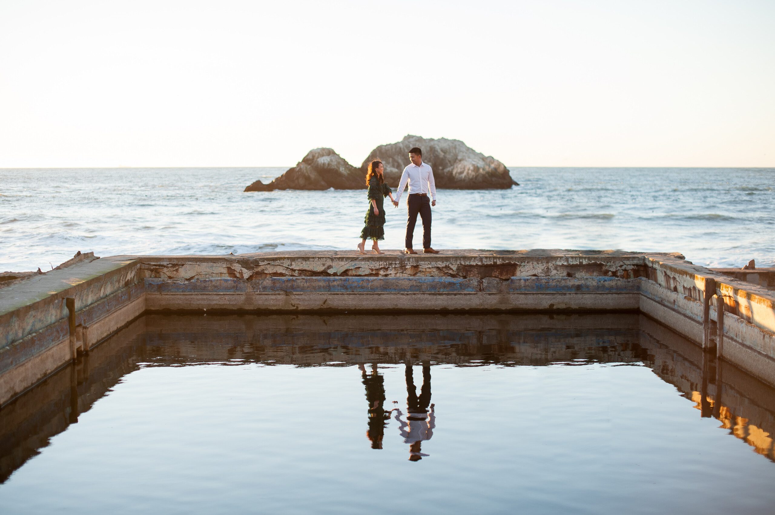 A couple holds hands while standing on a concrete edge by the ocean, with their reflection visible in a large pool of water in the foreground. A rocky island is in the background.