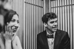 A woman smiling with her hands on her cheeks and a man in a suit and bow tie laughing, both sitting in front of wooden paneled screens. The photo is in black and white.